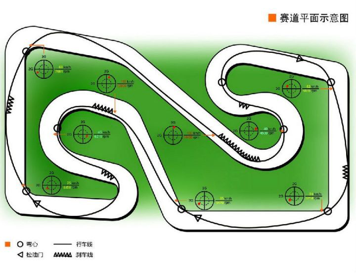 成都CESC流光速卡丁車場(chǎng)-是一條于今年進(jìn)行重新修建的賽車場(chǎng),原先本是度假村中娛樂(lè)用的賽道,現(xiàn)在改造后則是2015年CKC的一個(gè)分站。賽道全新,瀝青表面,很粗糙。因此賽車會(huì)比較容易推頭。整體風(fēng)格在深圳和三水之間,既有高速賽段也有低速賽段,但彎道數(shù)量其實(shí)不多。賽道比較窄,因此龍門架(圖中黑白格子線處)前后的高速直角彎比較關(guān)鍵,因?yàn)檫@直接決定了之后的大直道的尾速。比較有特點(diǎn)的是2號(hào)~3號(hào)彎及5號(hào)~6號(hào)彎,是高速直角彎后轉(zhuǎn)入下坡,并需要迅速制動(dòng)的低速掉頭彎,需要車手有良好的反應(yīng)速度及體能。